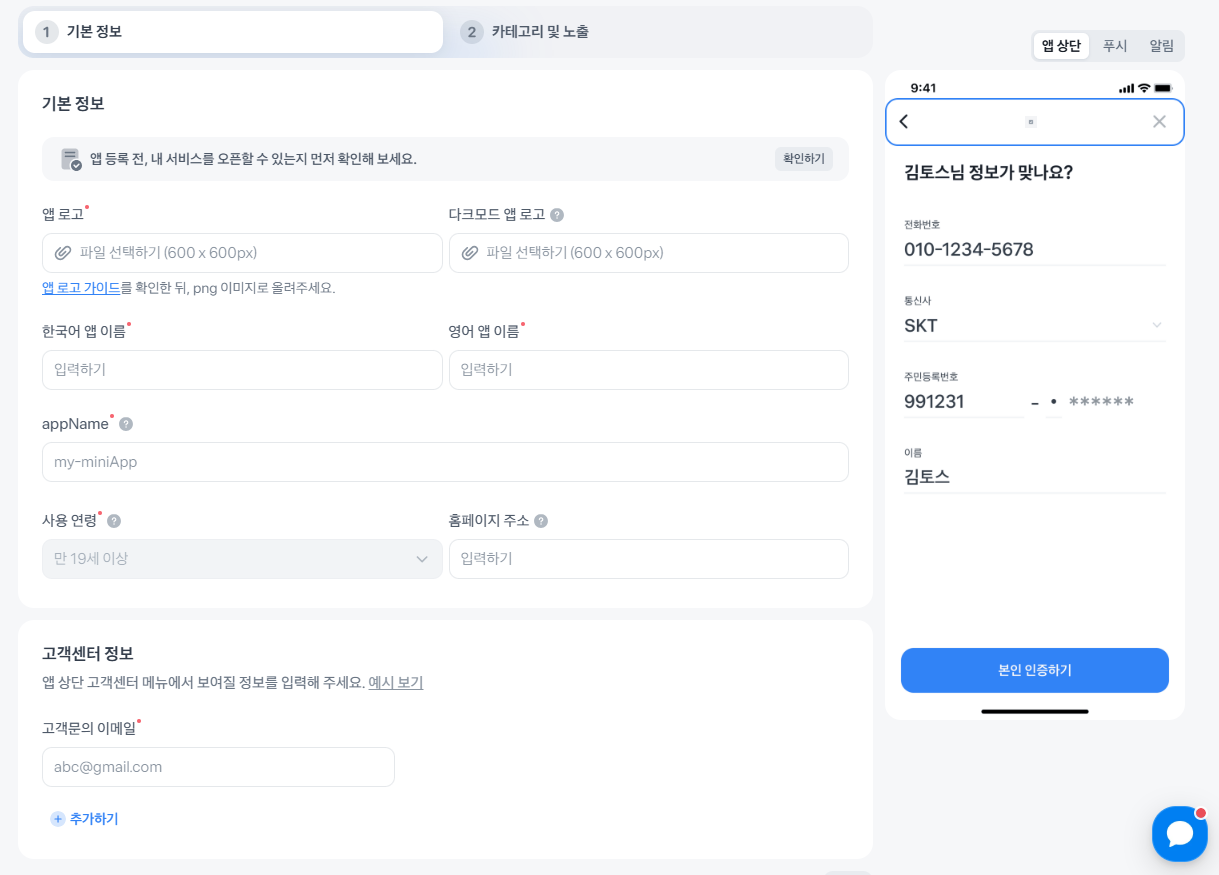 앱 등록을 위해서는 기본 정보와 카테고리 및 노출 입력을 해야합니다.